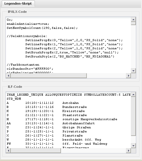 Diese Registerseite zeigt die für die darzustellenden Symbole erstellten Skripte an. Das Bearbeiten des IPALX- und ILF-Code ist bei den Legendentypen "Einfaches Symbol", "Klassifikation - Einzelwert" und "Klassifikation - Bereich" nicht zulässig.