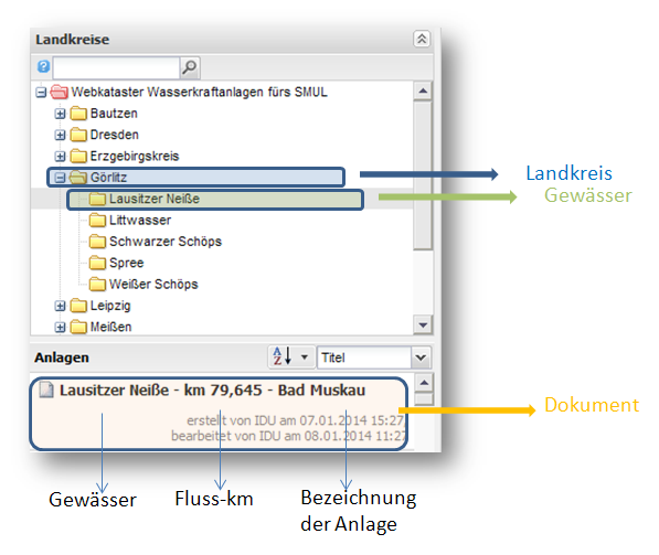 Im Webkataster Wasserkraftanlagen werden die Anlagen in einer übersichtlichen Ordnerstruktur verwaltet. Auf erster Ebene werden für die Landkreise des Freistaates Sachsen jeweils separate Ordner angelegt. Unterhalb des Landkreisordners befinden sich in zweiter Ebene die Ordner für die zu verwaltenden Gewässer. In der dritten Ebene werden die Dokumente zu den einzelnen Wasserkraftanlagen abgelegt. Die Bezeichnung der Dokumente wird durch das System nach folgendem Schema vergeben: