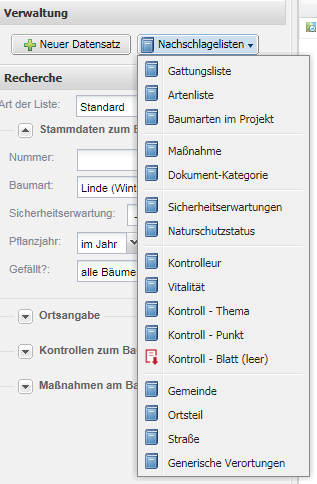 Die Bearbeitung der Nachschlagelisten ist für alle Listen gleich. Der Bearbeiter wählt durch einen Klick die gewünschte Liste aus.