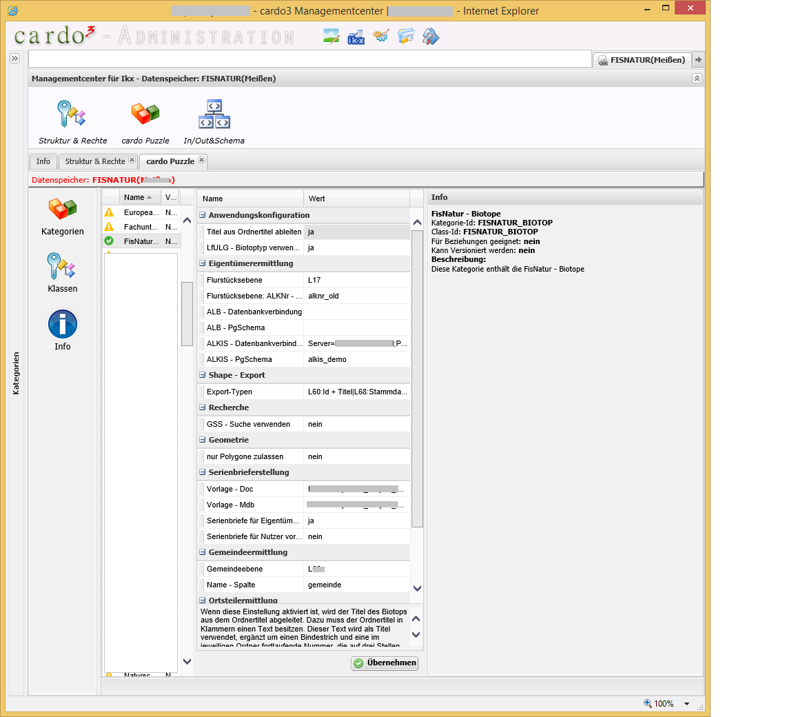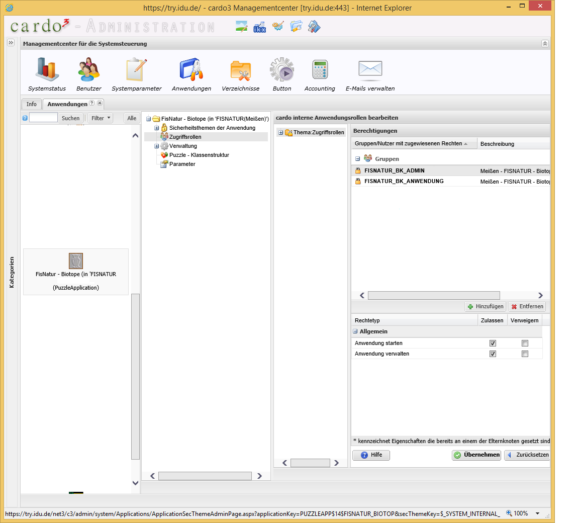 Damit der Anwender FIS-Natur.Biotope nutzen kann und die Anwendung auch im Auskunftssystem zur Verfügung steht, muss der Administrator die Anwendung im Management Center von cardo registrieren.