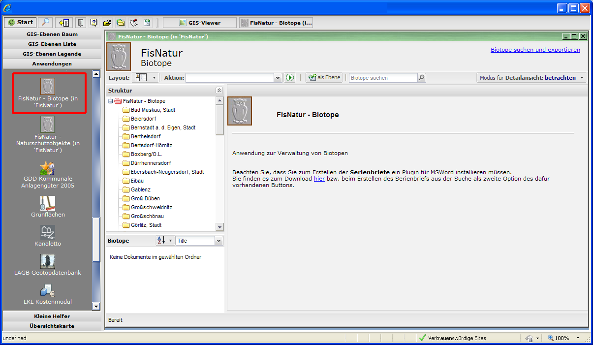 Im FIS-Natur.Biotope können die einzelnen Biotope in einer komplexen Ordnerstruktur verwaltet werden. Aufgrund der zu erwartenden Datenmenge ist das Verwenden von Ordnern zu empfehlen.