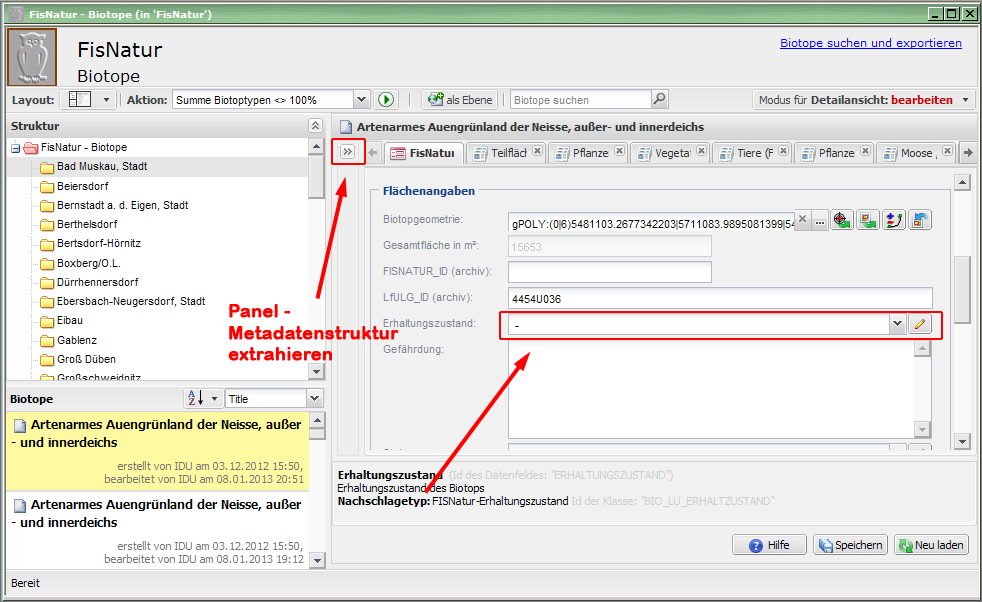Hinweis zum Löschen eines Nachschlagewertes: Beim Löschen eines Nachschlagewertes ist zu beachten, dass Werte, die noch in den vorhandenen Daten zu Biotopen verwendet werden, nicht löschbar sind. In diesem Fall erscheint eine entsprechende Meldung.