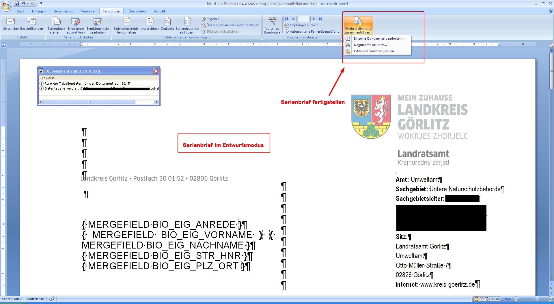 Sie können durch einen einfachen Linksklick auf die Schaltfläche Fertigstellen und Zusammenführen das weitere Verfahren auswählen. Beachten Sie, dass seit der Umstellung auf ALKIS - die Anrede in den Eigentümerdaten, durch das Grundbuchamt, nicht mehr gefüllt wird. Es wird deshalb empfohlen, dass eine neutrale Anrede in den Serienbriefen gewählt wird. Für eine persönliche Anrede ist die Nachbearbeitung der Dokumente obligatorisch.