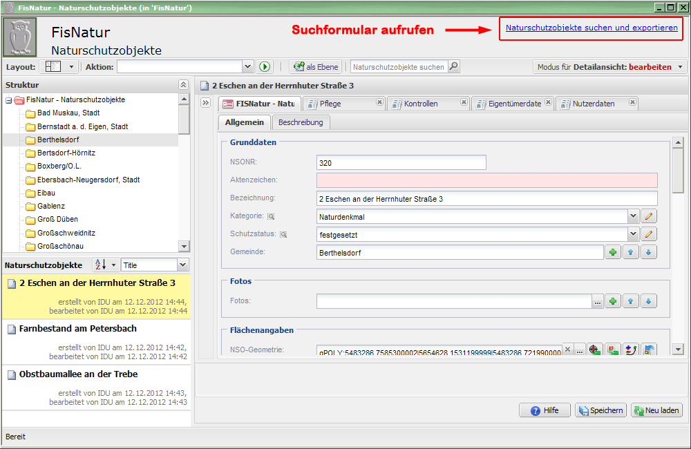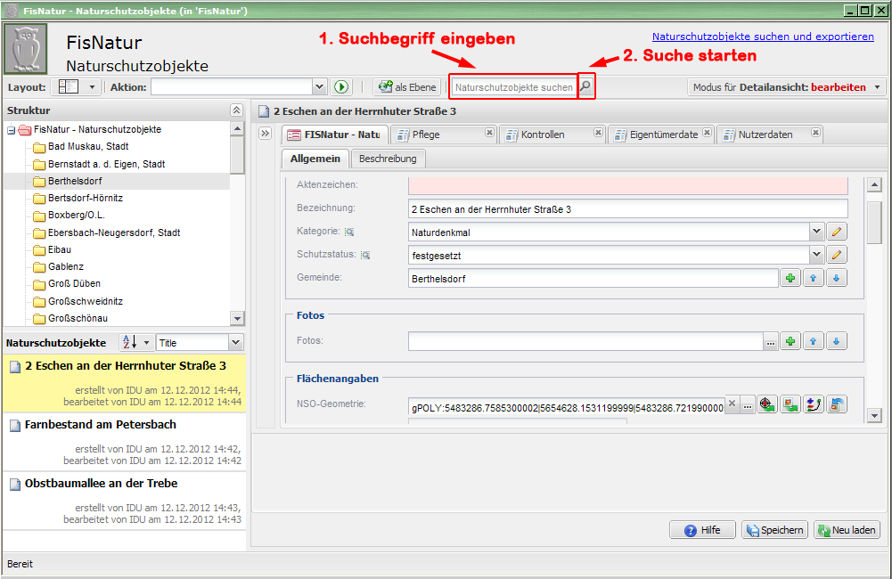 Im Kataster FIS-Natur.Naturschutzobjekte ist es möglich, Daten zu NSO, welche einen Suchbegriff enthalten, zu suchen. z. B. Suchbegriff: Baum.
