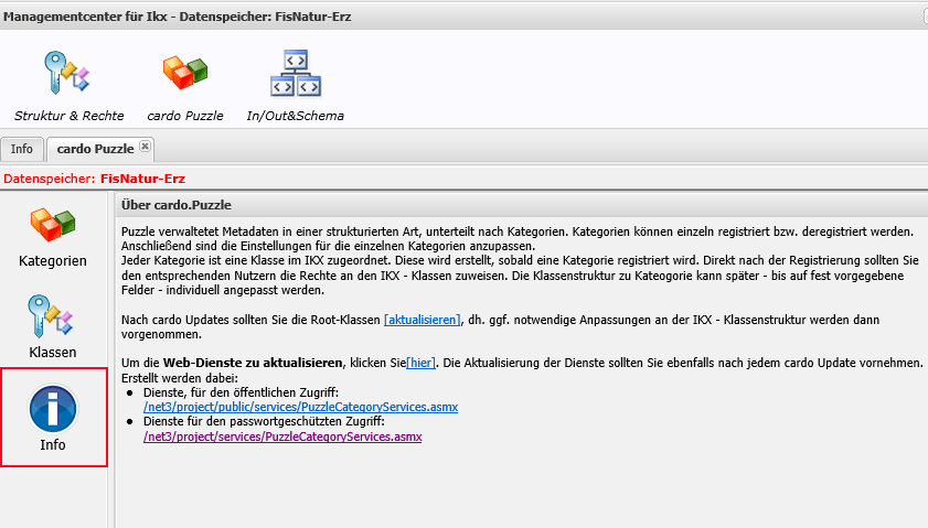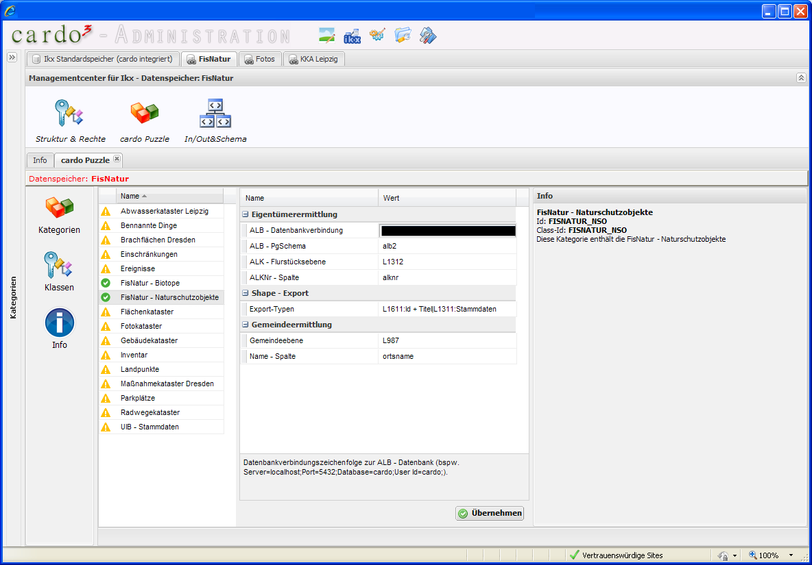 ikxStoreID: Geben Sie die ikxStoreId des ikxStores der Anwendung FISNATUR.Naturschutzobjekte an. (Die ID wird in der Registerkarte Info des ikxStores angezeigt.)