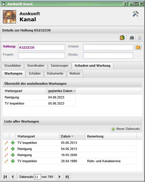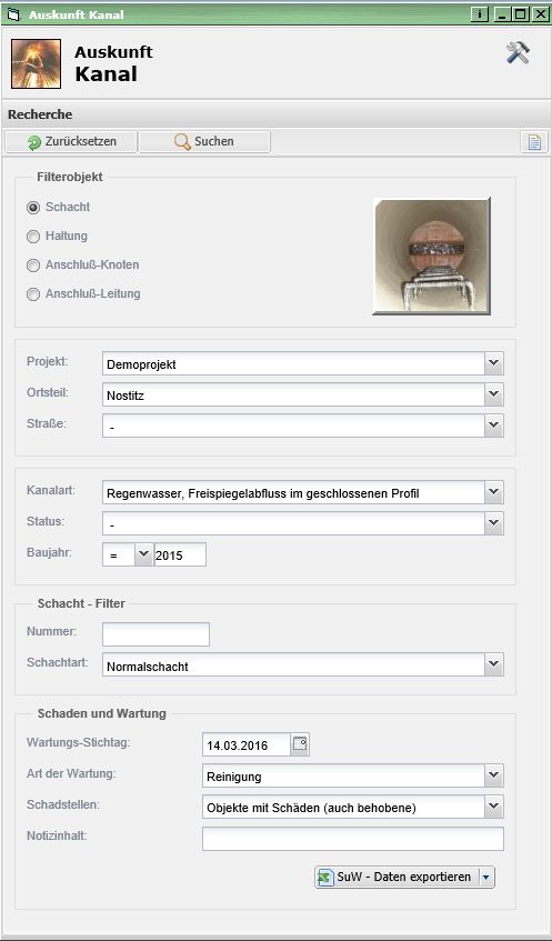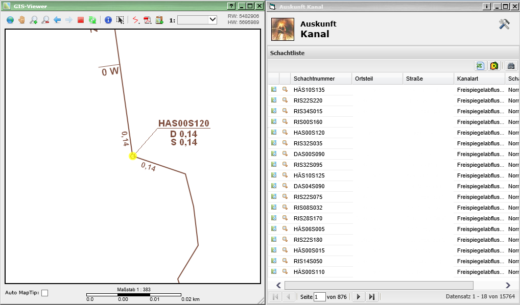 Die Kanalauskunft ermöglicht dem Nutzer in den Kanalbeständen nach verschiedensten Inhalten, wie Schacht, Halterung, Anschluß-Knoten oder Anschluß-Leitung zu recherchieren. Die gefundenen Objekte werden in einer Liste sortiert und können im GIS Viewer angezeigt werden. Berechtigte Benutzer können Informationen zur Wartung und Schadenserfassung ergänzen und bearbeiten. Der Export der Ergebnisliste ins Excel-Format ist selbstverständlich möglich.