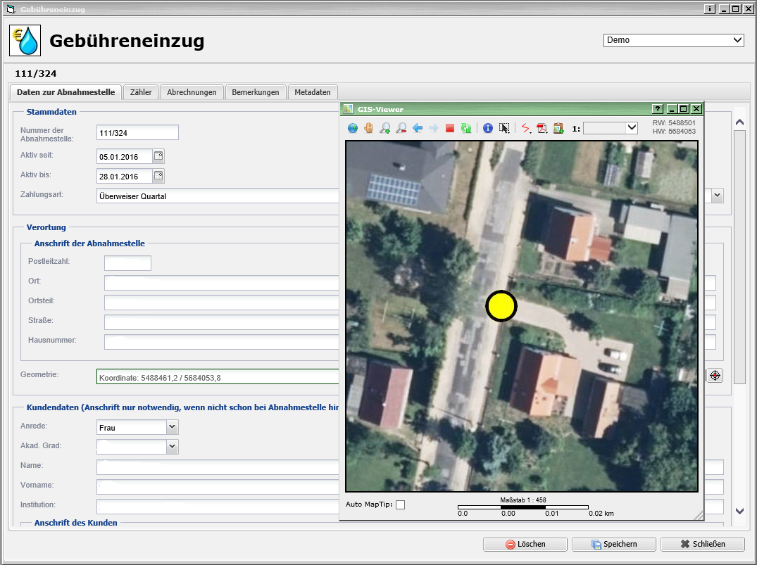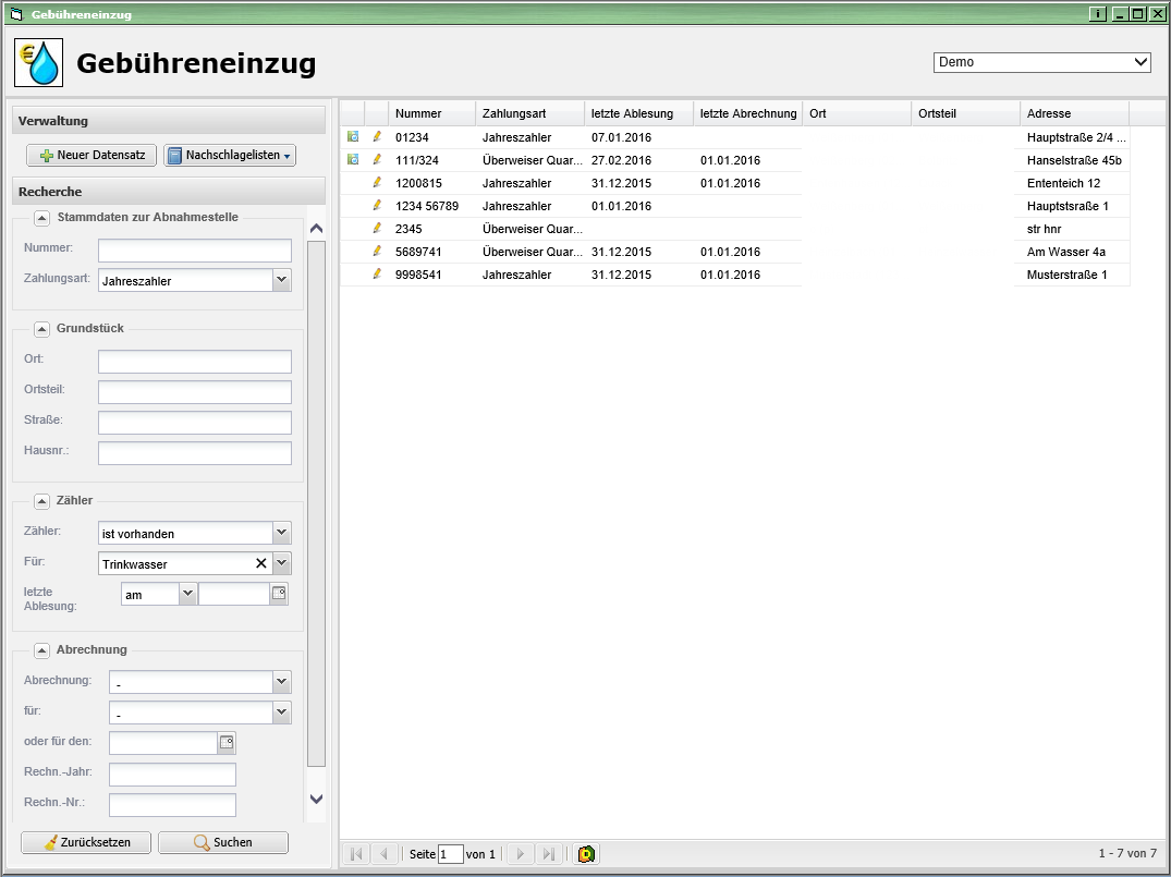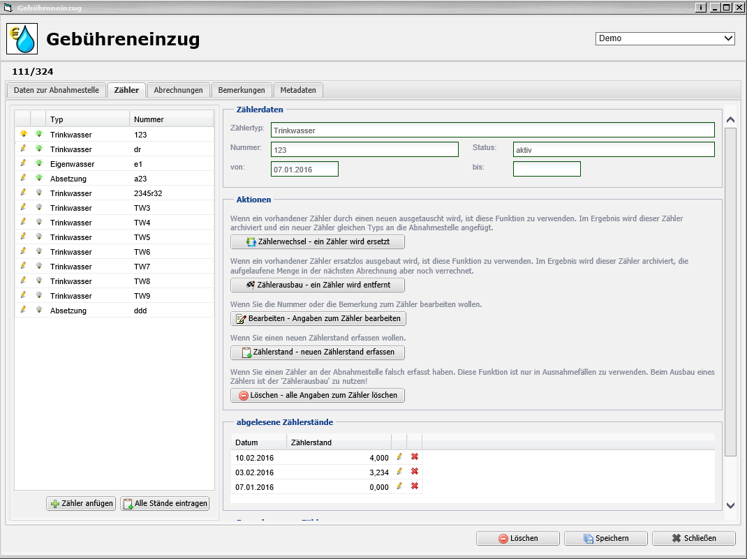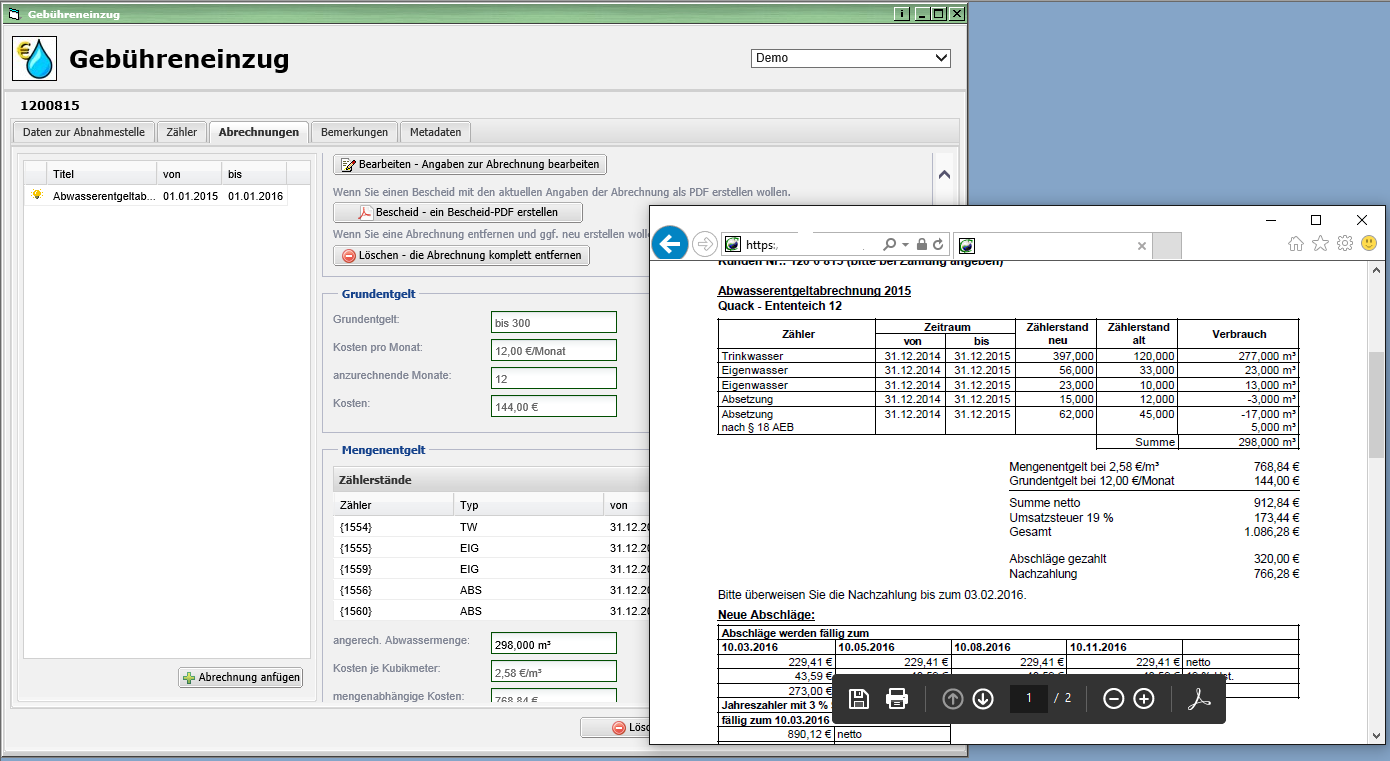 Mit Hilfe der Anwendung Gebühreneinzug können die Zählerstände für Trinkwasser/Eigenwasser und Absetzung verwaltet, aktualisiert und der Verbrauch berechnet werden. Sind alle nötigen Daten erfasst, kann der Bearbeiter in einer separaten Dialogseite die Gebührenbescheide erstellen und ausdrucken.