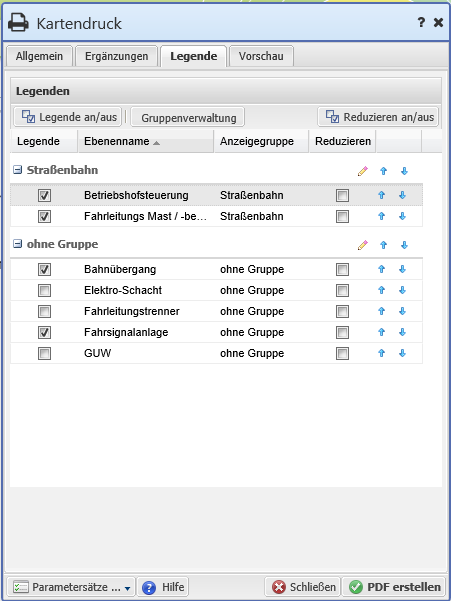 Über die Checkboxen in der Spalte 'Legende' wird festgelegt, ob die einzelnen Legenden grundsätzlich im Ausdruck berücksichtigt werden. Über den Button 'Legende an/aus' kann diese Einstellung für alle Legenden in der Tabelle an-/ausgeschaltet werden.